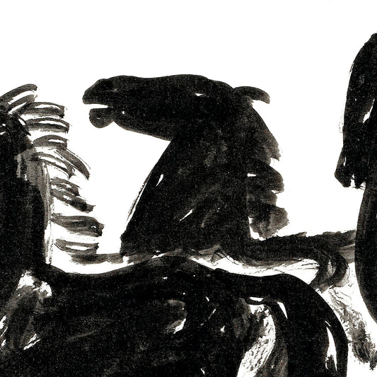 Drie zwarte paarden staand naar links lijkend