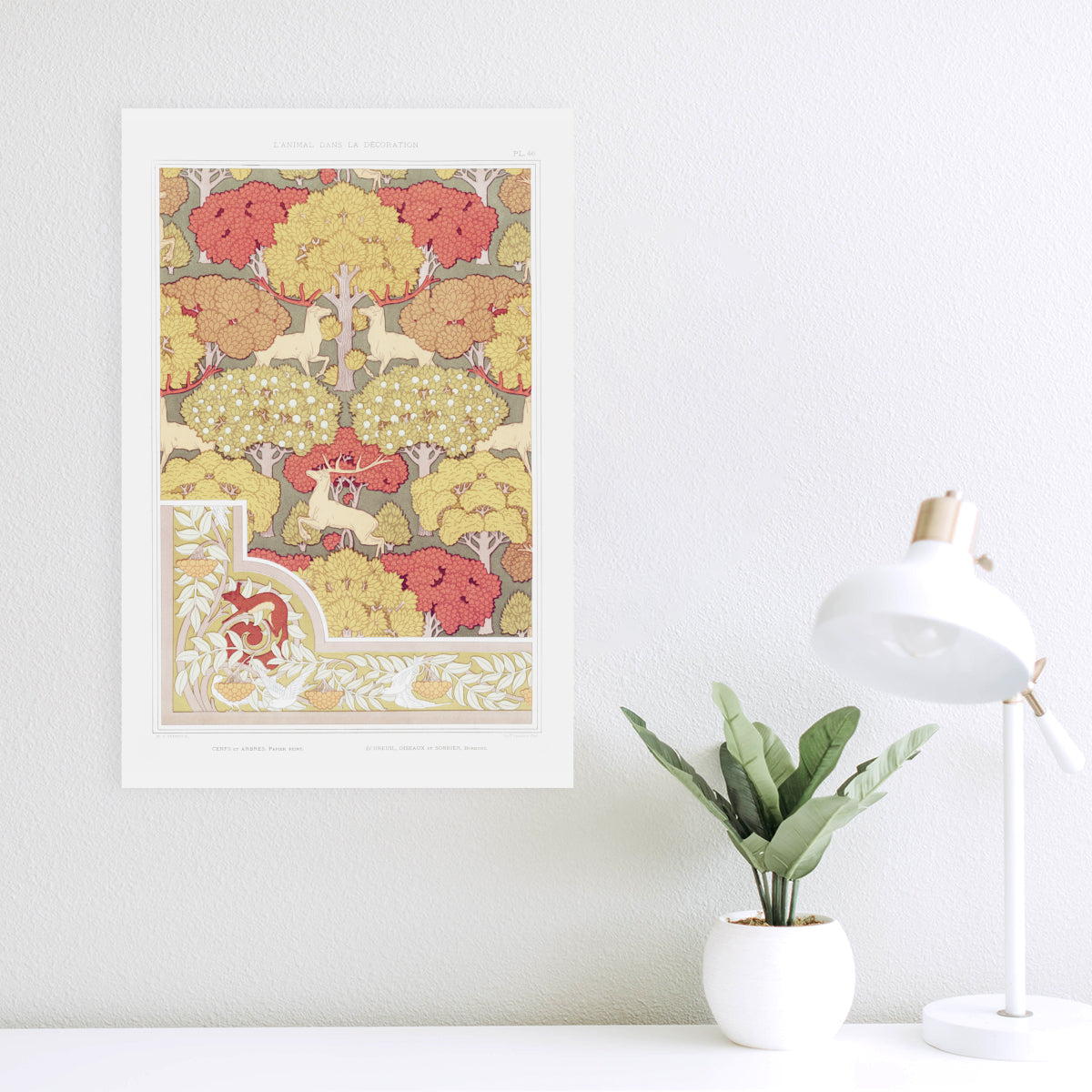 In seiner Mappe "L'animal dans la décoration" von 1897 zeigt Verneuil eine reiche Vielfalt an Mustern, die auf Pflanzen- und Tierformen basieren: Vögel, Fische und andere Meerestiere, Muscheln und Insekten (darunter die beliebten Fin-de-siècle-Motive Schmetterlinge und Libellen) sowie pflanzliche Umweltformen wie Blumen und Bäume. Er reduziert die Lebewesen auf spielerische dekorative Elemente und geometrische Muster und liefert Dutzende von eindrucksvollen Beispielen, die Innenarchitekten bei der Gestaltung von Tapeten, Textilien, dekorativen Beschlägen oder gemalten Bordüren und Friesen als Vorlage dienen können.